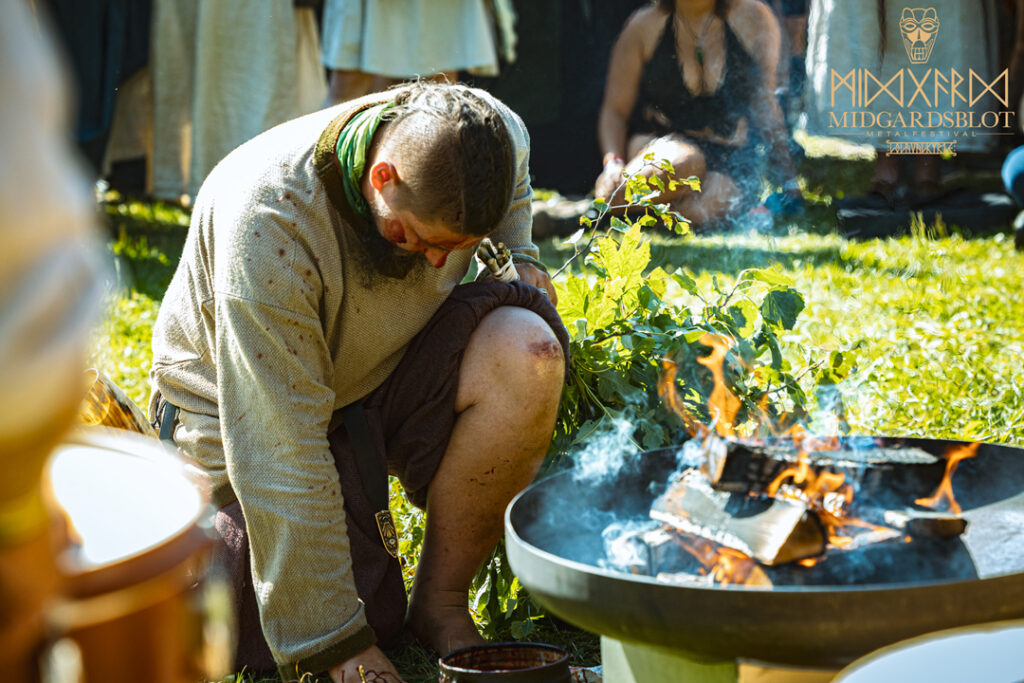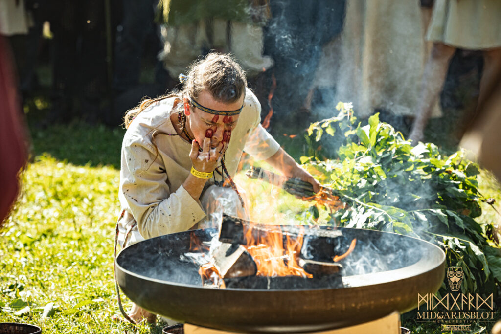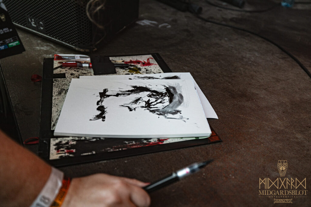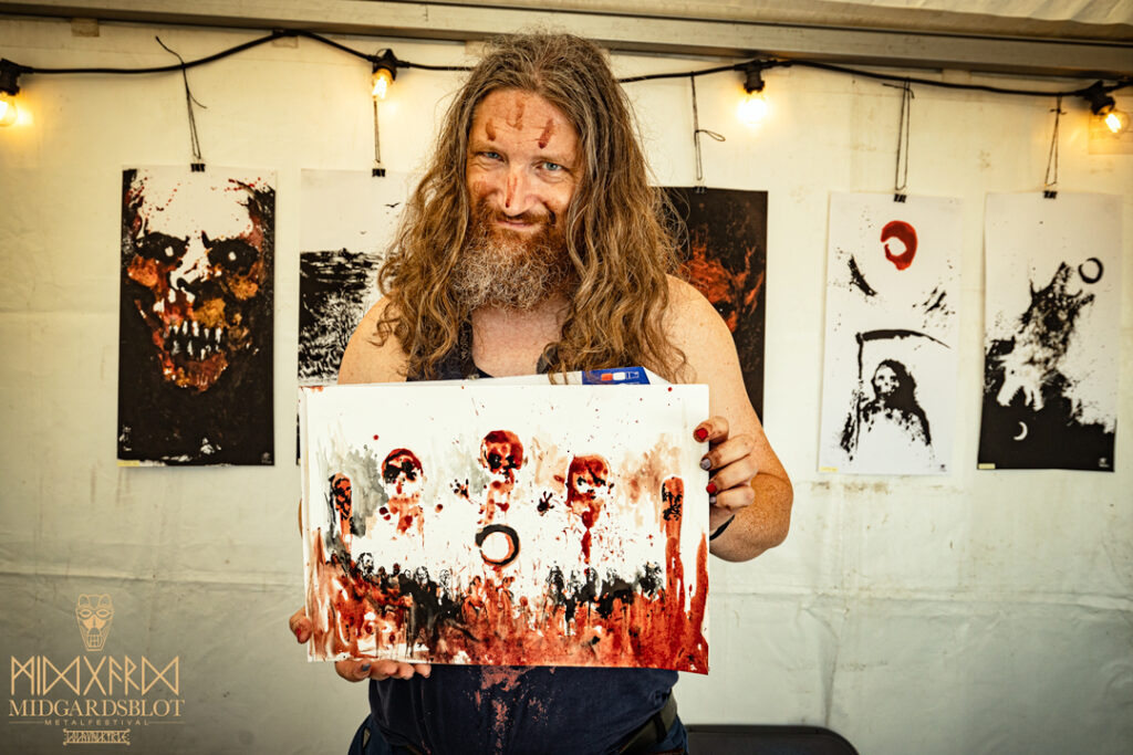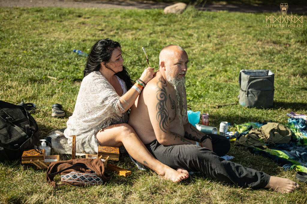 At the start of the festival every year, a Blot Ceremony is held. Without any religious or nationality orientation attached to this ceremony, you could dedicate the blot to yourself without feeling judged by anyone, as they welcomed everyone. The community was amazing at showing care for everyone, no matter where you came from or what you believed in. This year in particular, even three little babies were being celebrated in the blot at the very beginning. It is an amazing key part of the festival that many await with a feeling of “I’m back here to celebrate with my friends from all over the globe!” With drums and dancers around the fire, people took a small break to express gratitude. This year in particular, we had the amazing painter from Bergen, Norway, Kim Diaz Holm, who captured the blot ceremony in blood and painting.