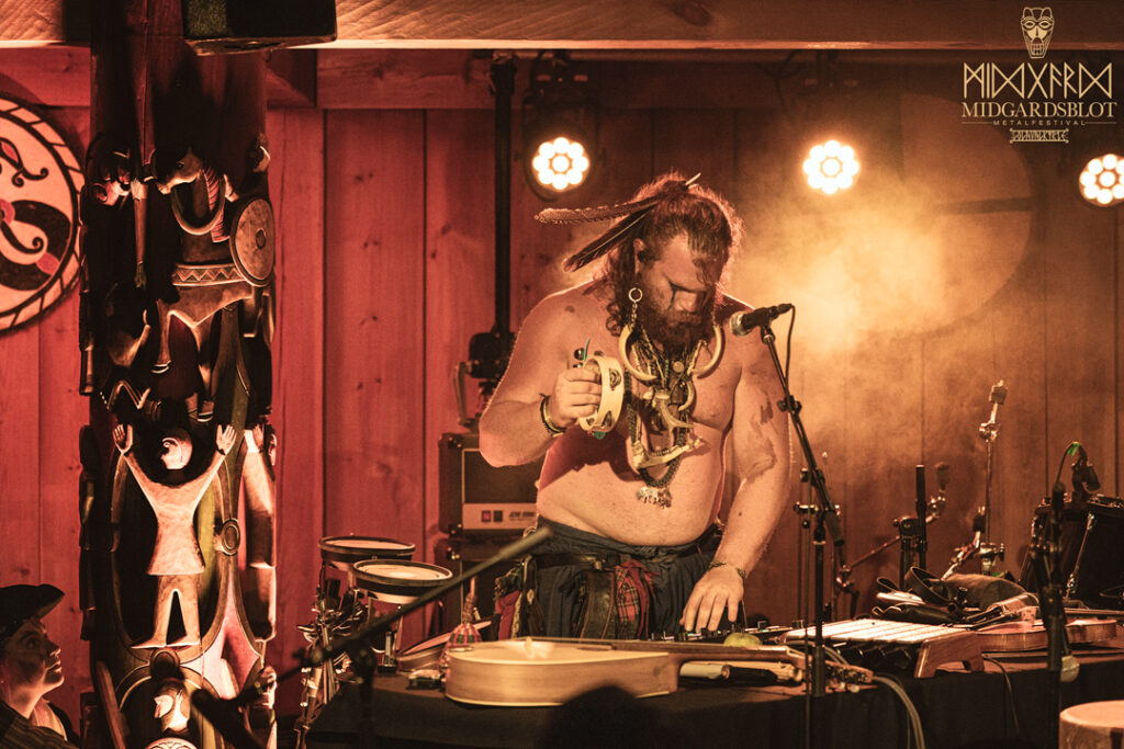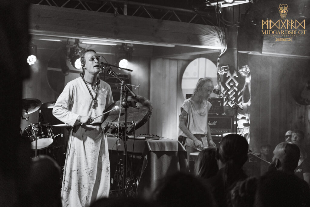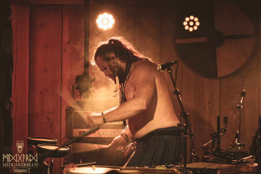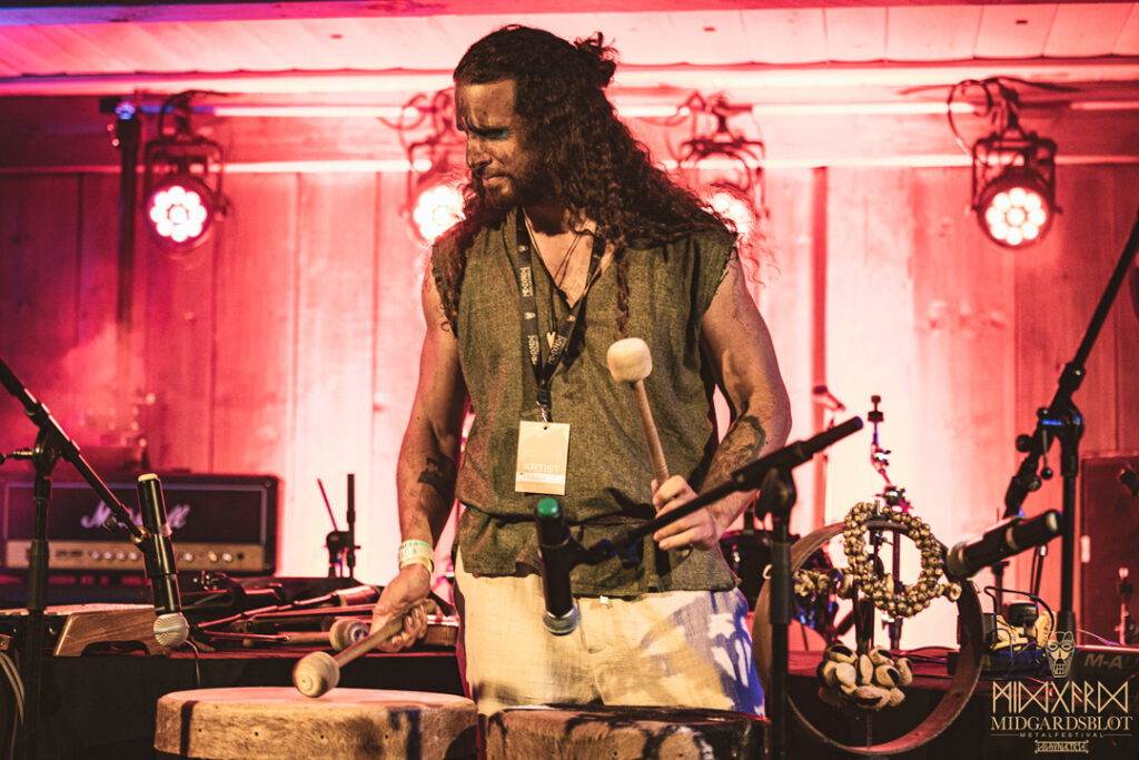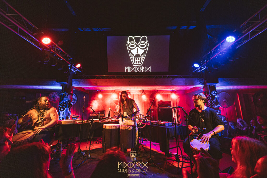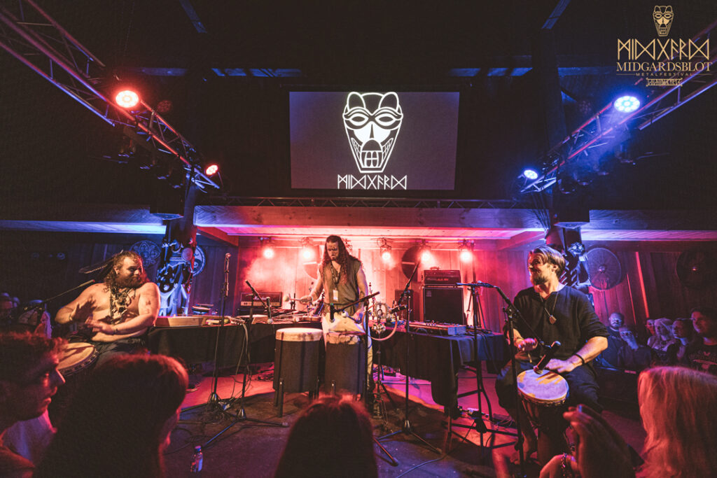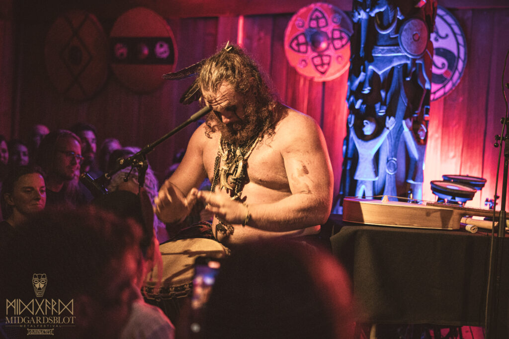 After the blot ceremony concluded, the music started! This year we had a very iconic band, VOLUSPA, which initiated the music performances of the evening. With their amazing, purely crafted songs for this community, they played “MIDGARDSBLOT,” “Heathen Heart,” and many other hits that they knew the blotters loved. After a beautiful performance by the Viking queen, we moved to the amazing Viking party hall, Gildehallen, to witness JOHNNY HEXX, singing along with Gustav Holberg and putting on a beautiful, emotive show with lots of trance drumming.