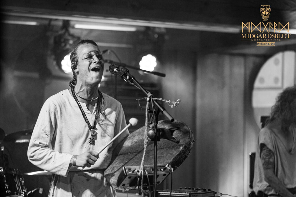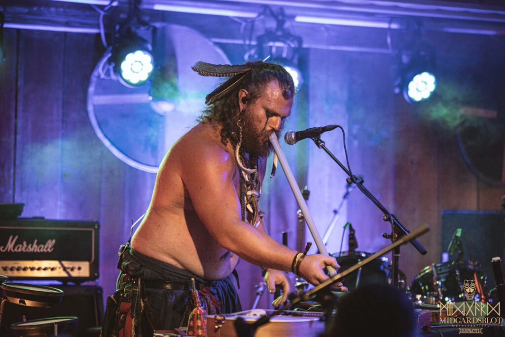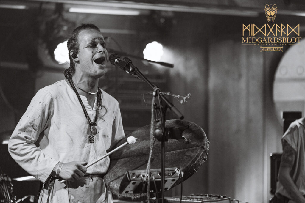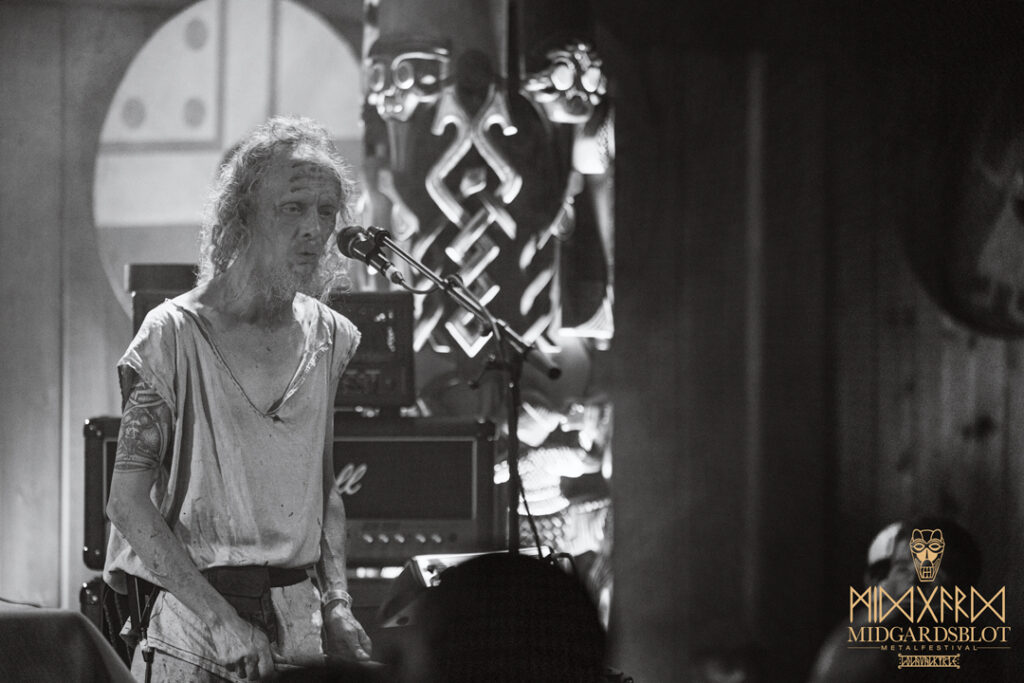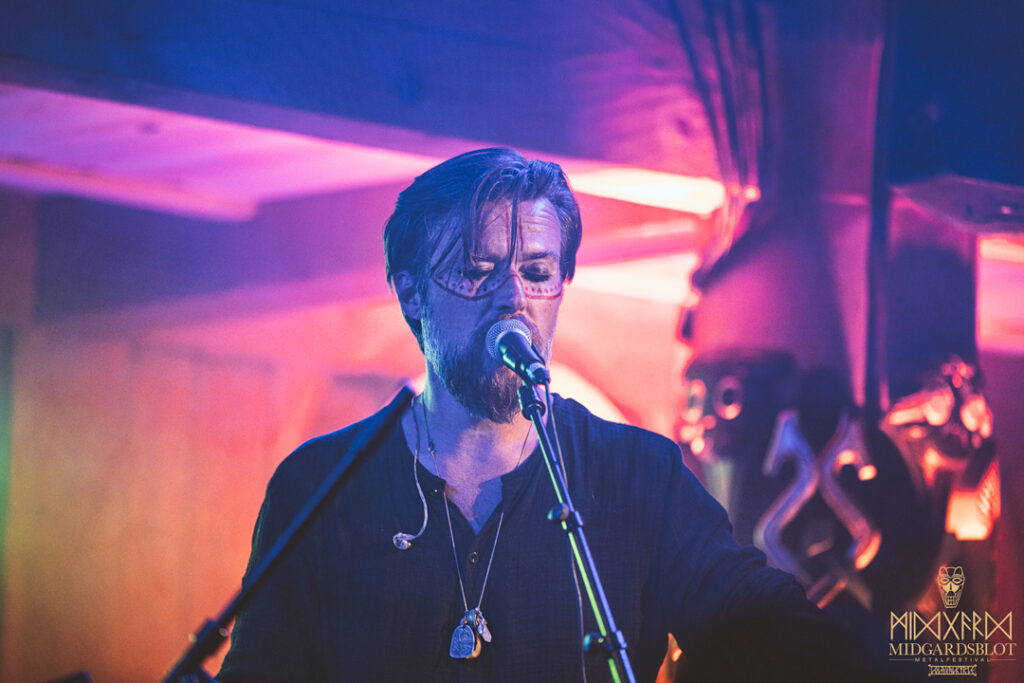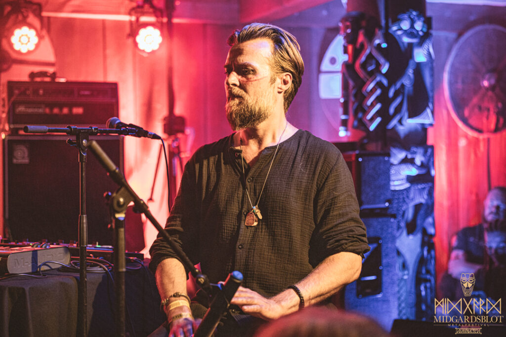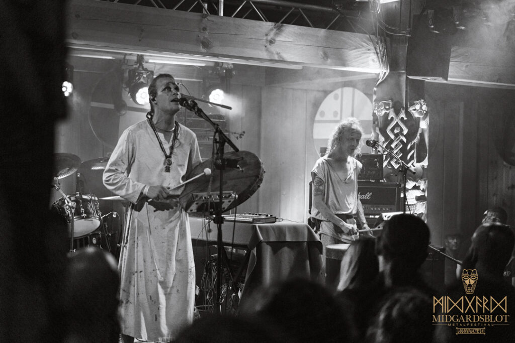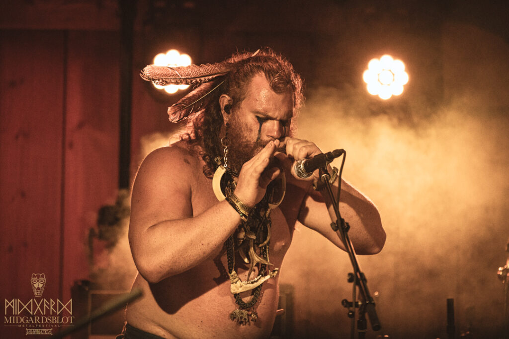 After the blot ceremony concluded, the music started! This year we had a very iconic band, VOLUSPA, which initiated the music performances of the evening. With their amazing, purely crafted songs for this community, they played “MIDGARDSBLOT,” “Heathen Heart,” and many other hits that they knew the blotters loved. After a beautiful performance by the Viking queen, we moved to the amazing Viking party hall, Gildehallen, to witness JOHNNY HEXX, singing along with Gustav Holberg and putting on a beautiful, emotive show with lots of trance drumming.
