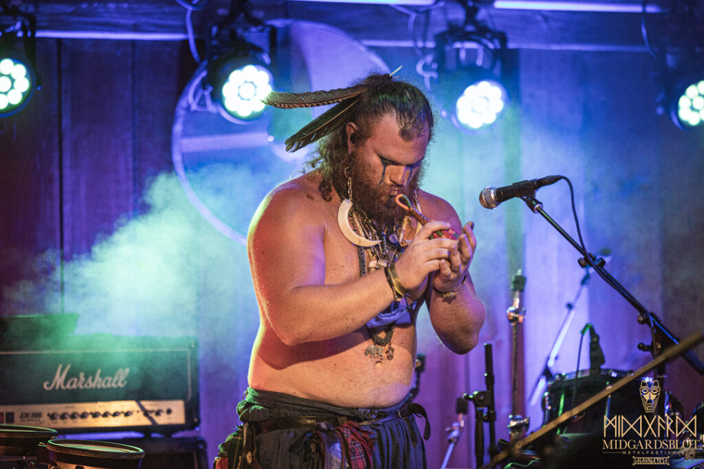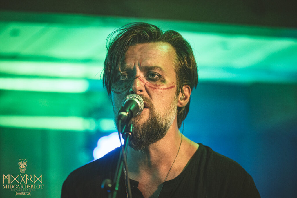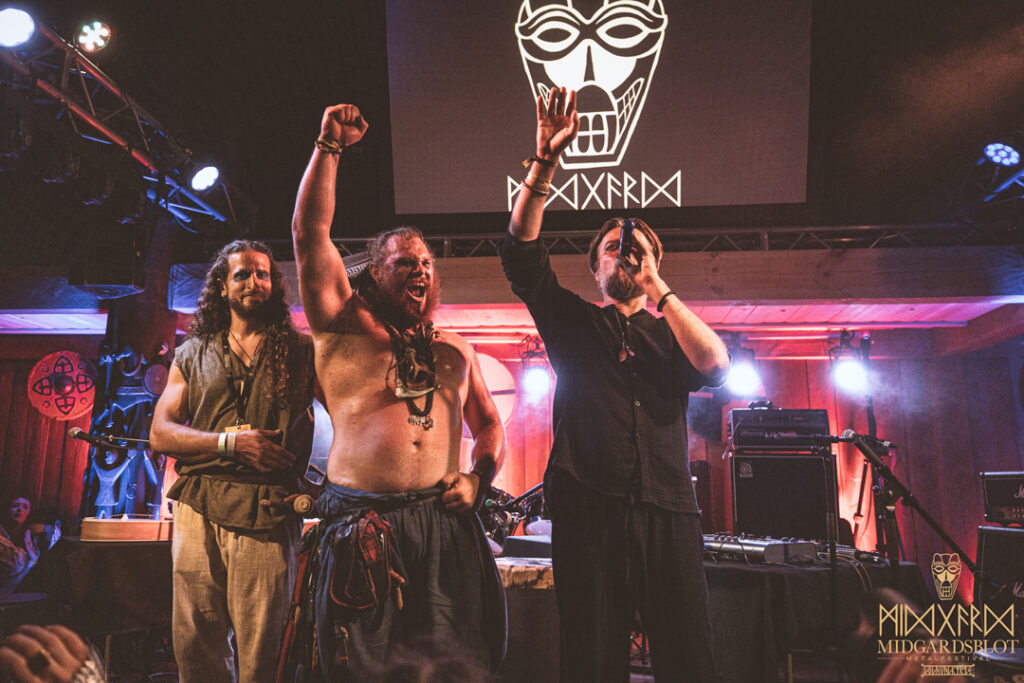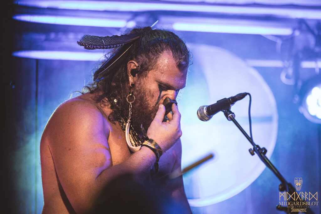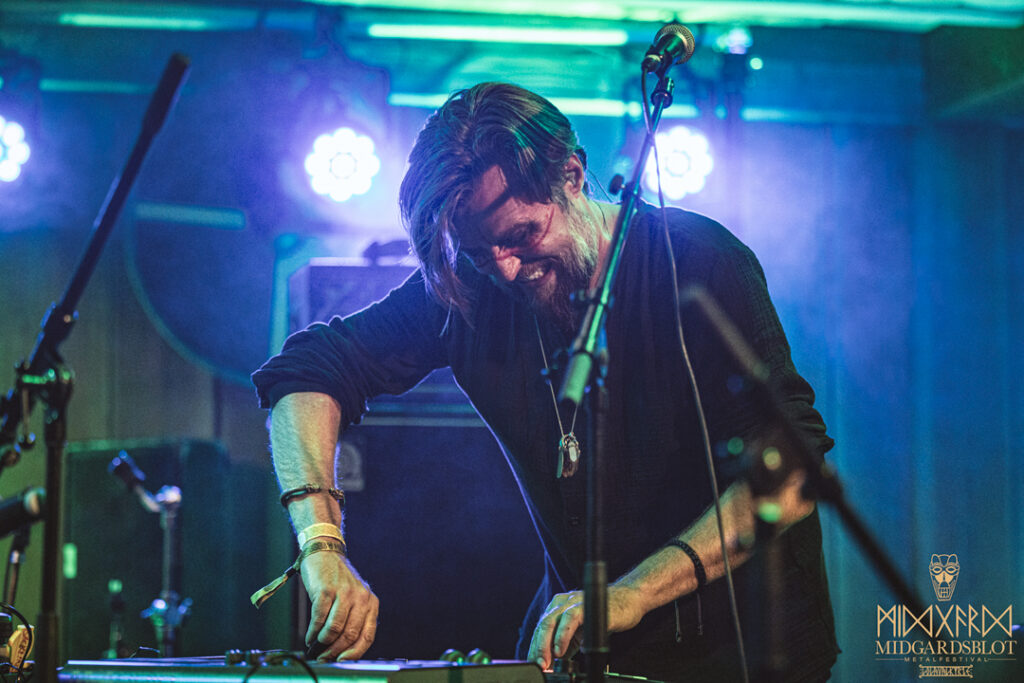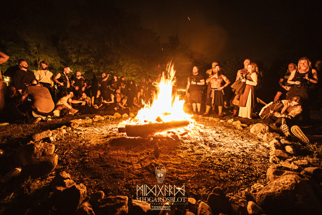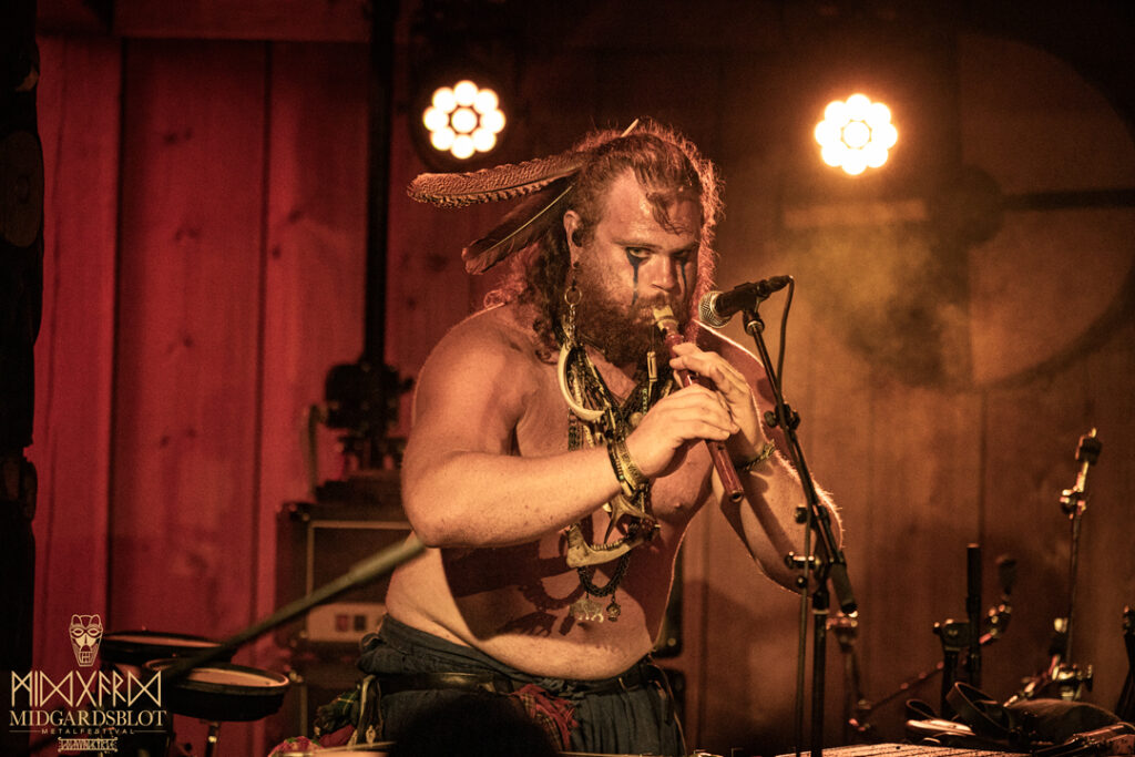 After the blot ceremony concluded, the music started! This year we had a very iconic band, VOLUSPA, which initiated the music performances of the evening. With their amazing, purely crafted songs for this community, they played “MIDGARDSBLOT,” “Heathen Heart,” and many other hits that they knew the blotters loved. After a beautiful performance by the Viking queen, we moved to the amazing Viking party hall, Gildehallen, to witness JOHNNY HEXX, singing along with Gustav Holberg and putting on a beautiful, emotive show with lots of trance drumming.