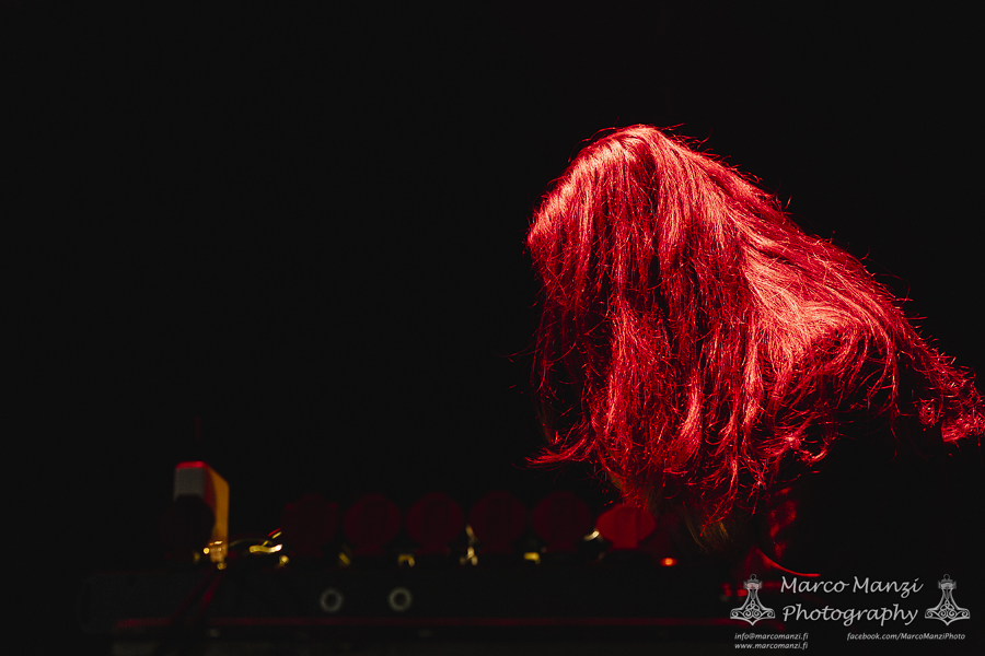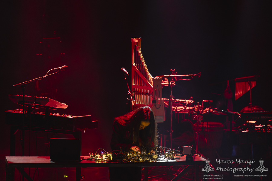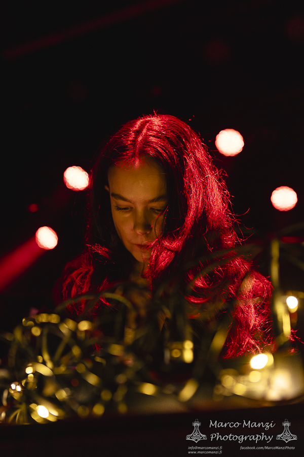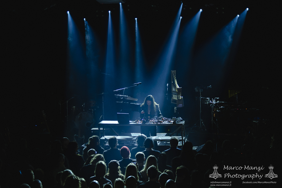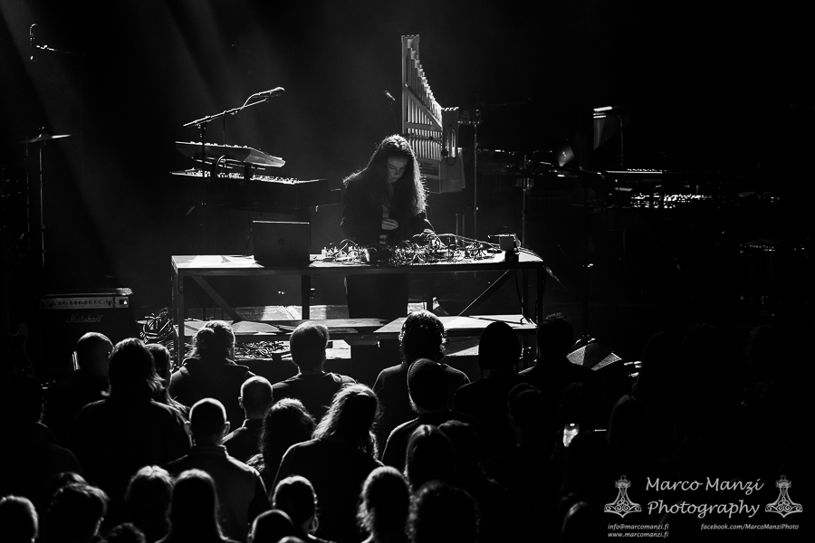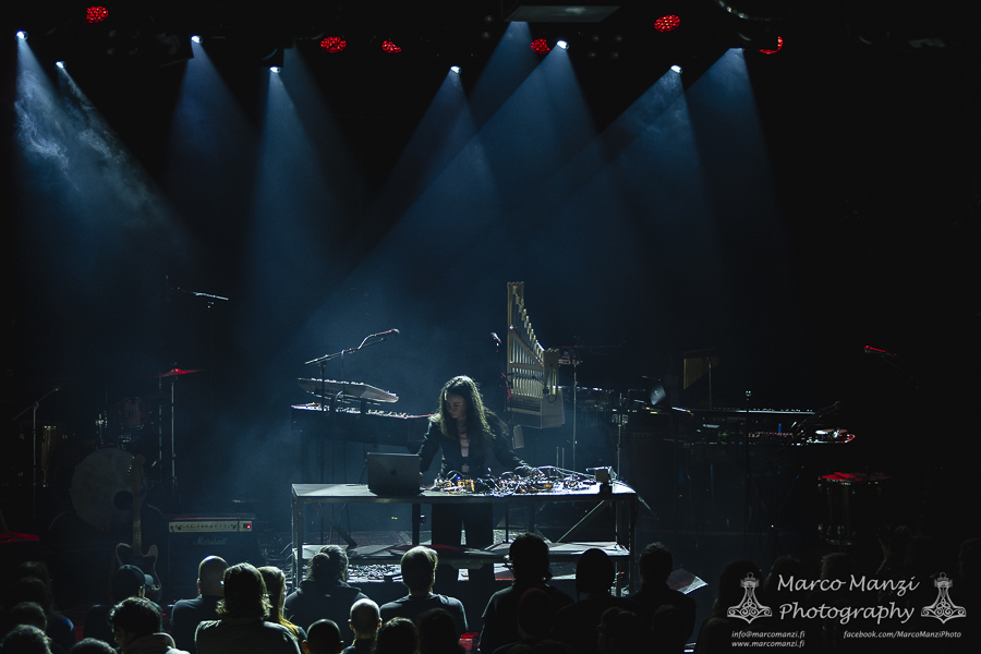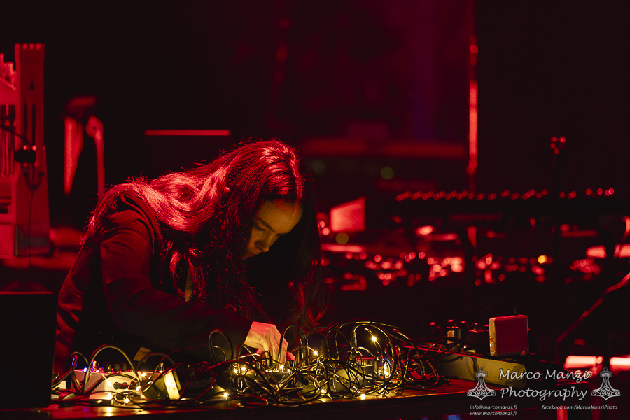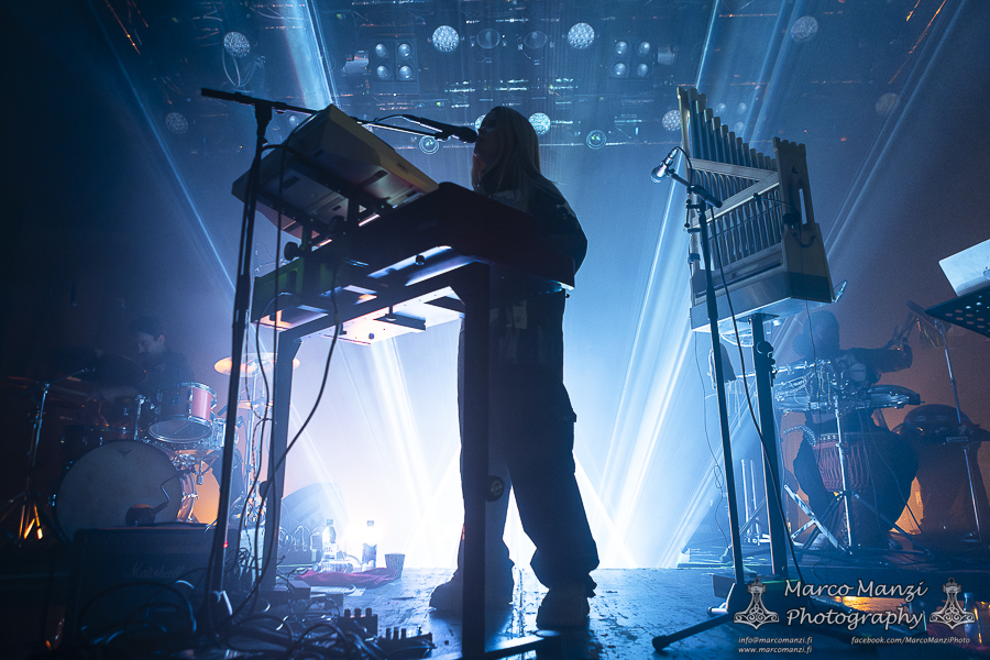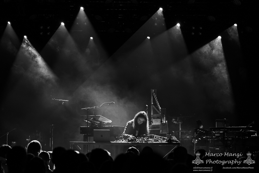 It had been a while since the last time inside Tavastia, and some small renovations made the space somewhat more accessible to the crowd, although it’s still really hard to squeeze into the main hall when the venue is full, as was the case tonight. However, people were still flowing in when KLARA LEWIS took her spot on stage at the big table set up with festive Christmas lights with all her synths. Her set proved to be a good background for the audience to chill while waiting for the main act: filled with samples and sound recordings, it was more akin to an art performance than a concert, setting up the atmosphere just right.