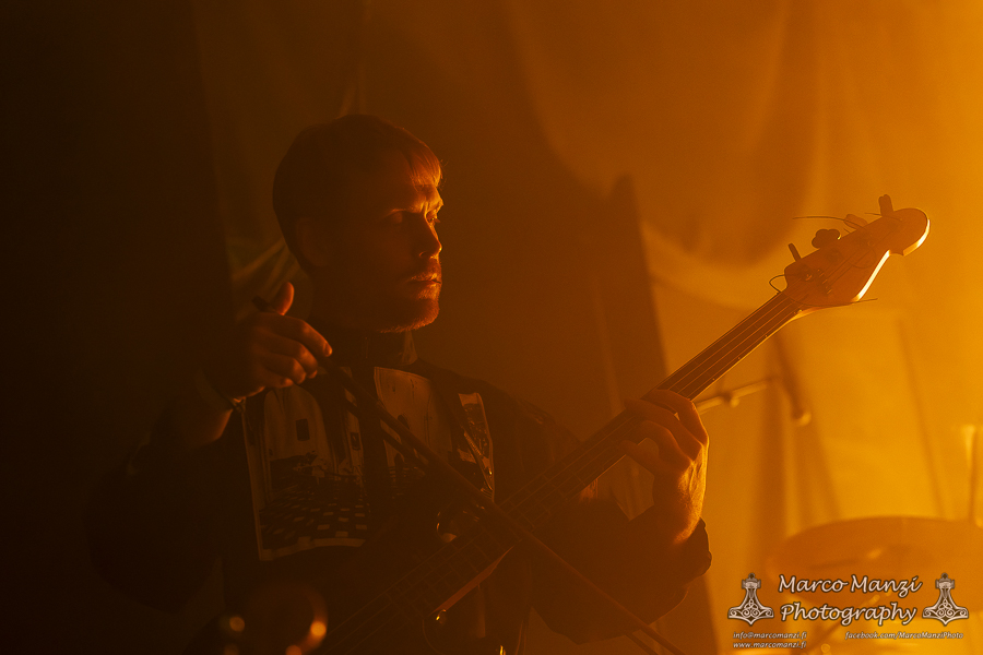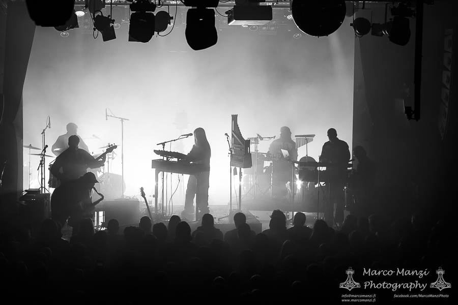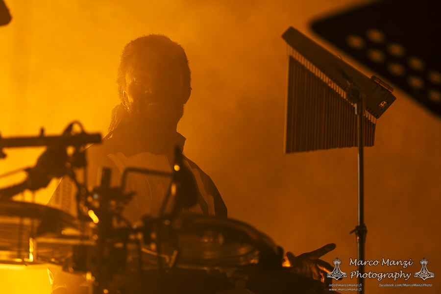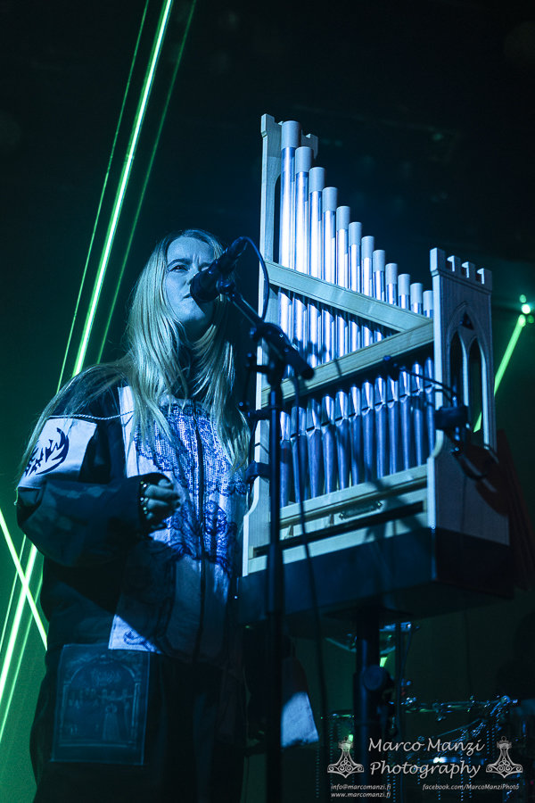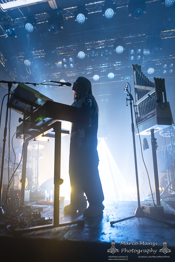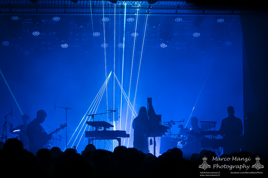 When ANNA VON HAUSSWOLFF took over about half an hour after the previous show, she started strong with the new record, very heavily represented in tonight’s set. Introduced by Otis Sandsjö‘s saxophone, “Consensual Neglect” kicked off the show as the other musicians slowly took their place on the crammed stage, at the center of which stood Anna‘s platform with her keys on one side and a pipe organ on the other. Perhaps the band and their crew was lagging a bit in space and time, given the last show was in Stockholm, as not only the first few words spoken to address the audience were in Swedish, but also the price tags at the merch stand were in crowns instead of euros (not sure if Danish, Norwegian, or Swedish, given the band went through all three countries in the previous days).